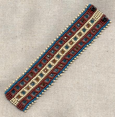 | The pattern is from Ande. You can find it at Arduinna under Mintak. Beads: Swarovskis 4mm: Indicolite, Crystal Copper, Dorado Seed beads 2,5 mm: Knorr chalk yellow 6201 05 Pracht matte redbrown Seed beads 2 mm: Prandell turquoise 5500 471 |