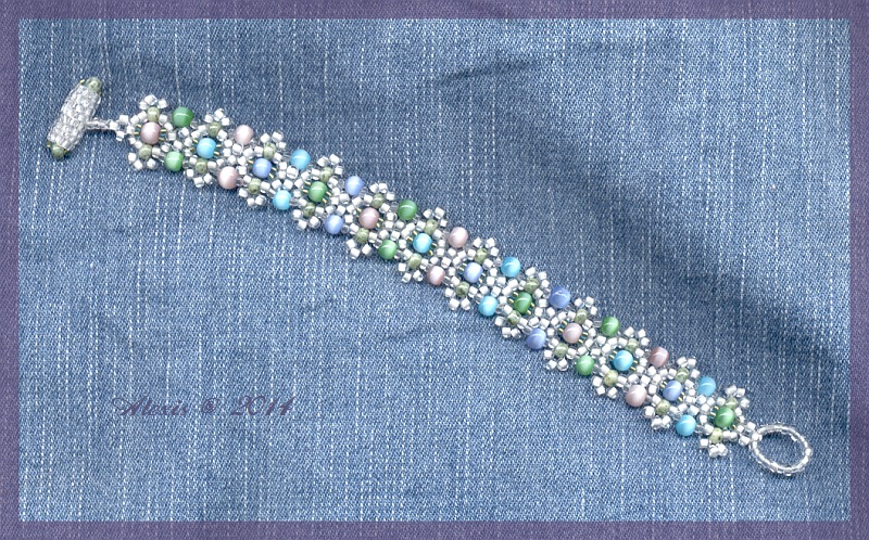 | The instructions are by Beejang. I just modified them by making only one row and embellishing the sides. Beads: 15/0 Toho 995 Matte 10/0 clear Beadreaming 00050-10 2,6 mm Seed Beads white inline Pracht 9234-3 8/0 Nonames 4mm Catseyes |
