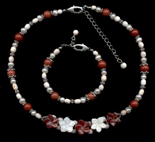 | The name? It reminds me of Hawaii ... Materials: The flowers are Jaspis and Mother of Pearl, the beads are Jaspis, freshwater pearls, Shelleys (made from shells, sold by the german Rayher), Silver and some seed beads. |