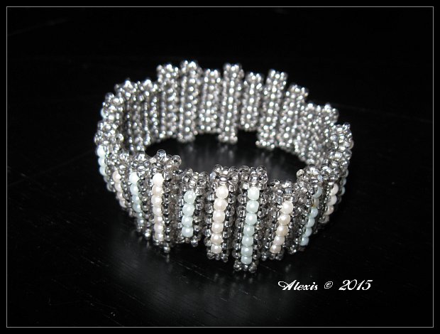 Die Anleitung ist von Jill Wiseman in der Zeitschrift Beadwork, June/July 2013. Ich habe die "Sticks" nur anders verbunden - ich habe sie auf der Unterseite mit Quadratstich aneinander befestigt. |