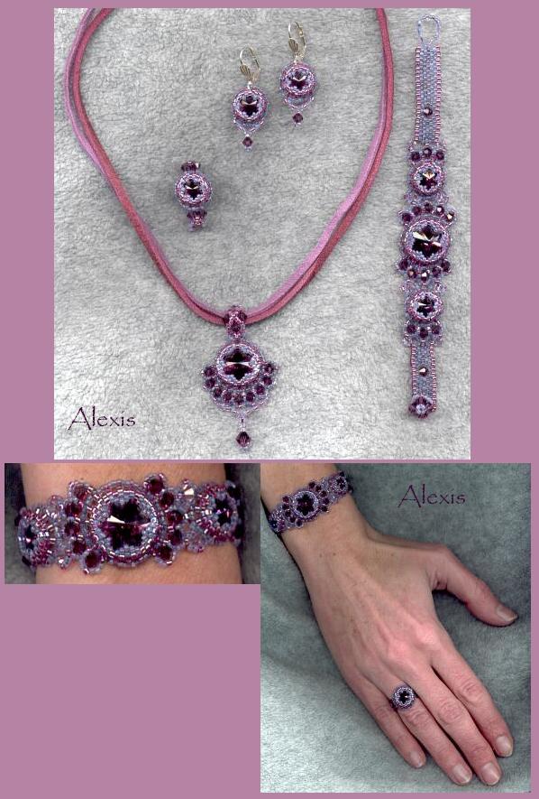 The instructions for the starshaped bezel are from Andrea Hoffstadt. You can see her jewelry here. The first round is inspired by Biloba. The second row with Swarovskis is from Suzanne Cooper's book Victorian and Variations. The beads I used: Rivoli 14 mm and 8 mm in amethyst (from HS-Store) The Swarovski bicones are mostly 4 mm amethyst, some 4 mm violet and one 6 mm amethyst Swarovski. The delicas are no. 56 lined magenta ab, the czech size 15/0 light lilac are no-names. |