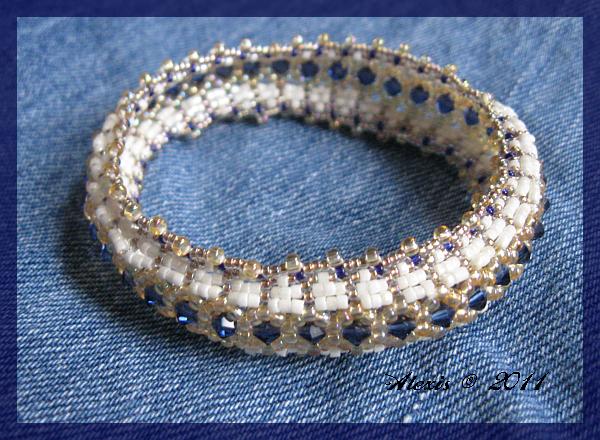 | The instructions are by Yuujcreations. Beads: 4 mm Swarovskis Dark sapphire 2 mm seed beads yellow rainbow Prandell 5500 251 Delicas 203 15/0 blue nonames 15/0 Toho 994 |