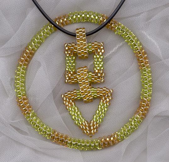 Wie man das Dreieck macht habe ich von Alexia Luikert gelernt. Man kann sie in der Yahoogroup 4TheLuvOfBeads kontaktieren. Das Quadrat ist nur eine Abwandlung davon, das Armband einfach eine Peyoteröhre um ein altes Drahtarmband. |