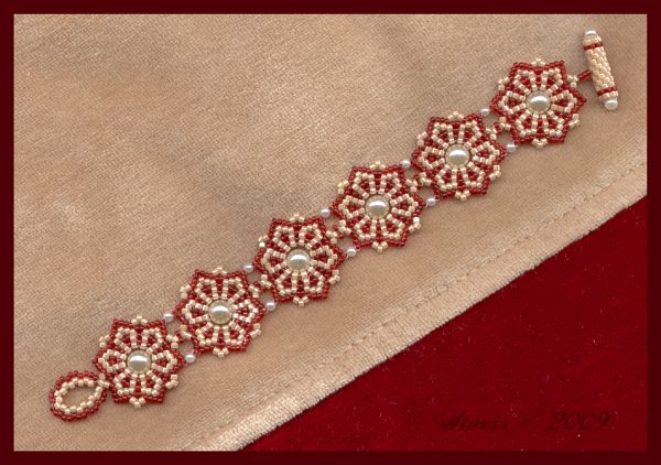 | Vezsuzsi's pattern Beads: Delicas 205 15/0 red (silverline removed by me) Beadreaming 602-15 6 mm and 2 mm round beads nonames 3 mm round beads nonames (closure) |