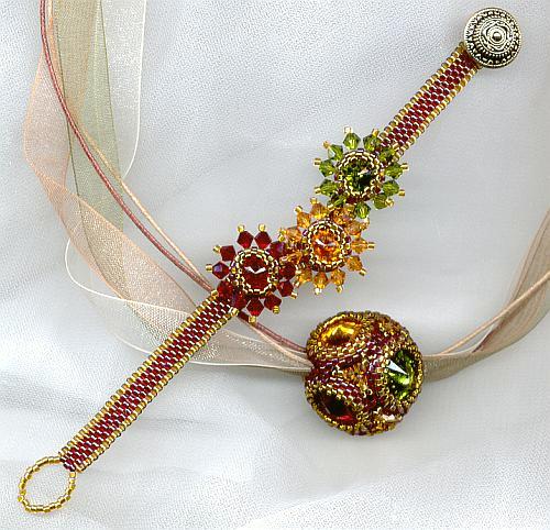 | The beaded bead is inspired by Laura Maccabes Crown jewels. The bracelet is inspired by Andrea Hoffstadt. Beads for the cube: Delicas 65 lined topaz AB Delicas 296 lined red cranberry AB 15/0 noname Rivoli 14 mm in topaz, siam, olivine 3 mm Swarovskis topaz For the bracelet: Delicas 65 lined topaz AB Delicas 296 lined red cranberry AB 8 mm Rivolis in topaz, siam, olivine 4 mm Swarovskis in the same colours |