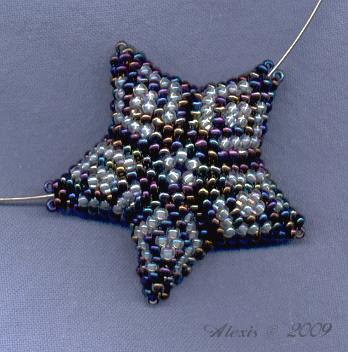 | I made this little puffy star after the Russian instructions at Salonbisera. Another (corean) pattern is at Artbeads. Beads: 2 mm black ab Rayher 14 062 01 2 mm light turquoise ab nonames |