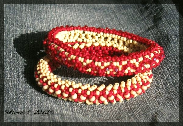 Die Anleitung ist von Minomars im französischen Forum HDPS. Perlen: 2,5mm Rocailles dunkelrot Knorr 6104150 gelb chalk Knorr 6201059 rot matt nonames 8/0 rot Beadreaming 90050-8 beige nonames 3mm Facetten rot Beadreamig 90100 AB |