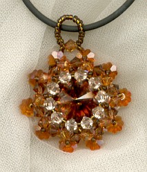 Instructions are at the french forum Ile aux Perles. Beads: Rivoli 14 mm smoked topaz Swarovskis 4mm silk, crystal copper, smoked topaz Swarovski flowers 6mm sun (Pundh-Perlen) 15/0 seed beads Beadreaming 612-15 2,5 mm seed beads Marianne Hobby 809-50 |