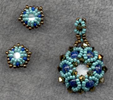 | The pendant is the ring St. Sorlin from the french forum Histoire de Perles. The earrings are my design - to be found on my instructions page. The beads for the pendant 12 mm cabochon catseye white 5 mm Sodalith 4 mm Swarovskis 2x dorado 11/0 mint from Beadreaming 68130-11 11/0 blue nonames 11/0 antique gold Prandell 5500 457 The beads for the earrings 4 mm white catseye the same seed beads as above |
